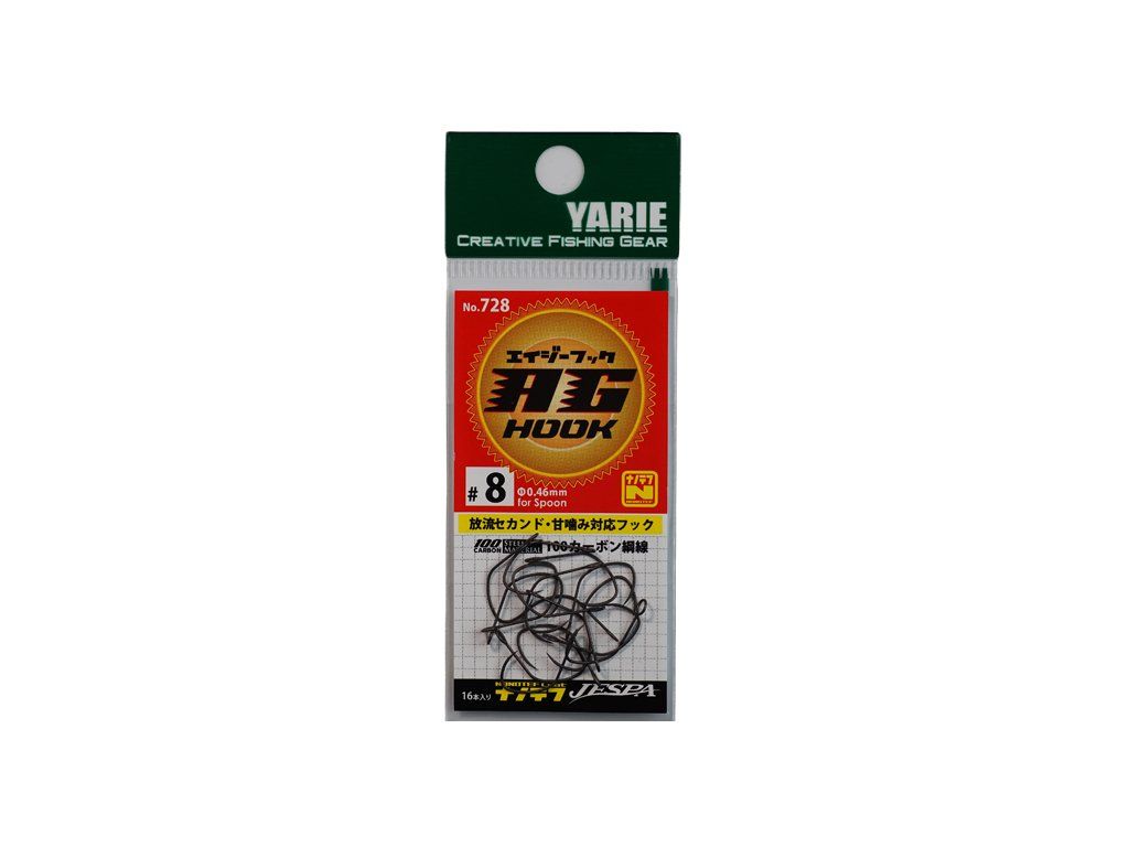 Plandavkové bezprotihrotové jednoháčky Yarie AG Hook 728 jsou pro maximální pevnost a ostrost vyrobeny z vysoce uhlíkové oceli. Háčky jsou extrémně ostré pevné a tenké, opatřené povrchovu úpravou NANOTEF. Tyto háčky jsou doporučovány v situacích, kdy jsou ryby neaktivní a záběr jsou velmi opatrné.