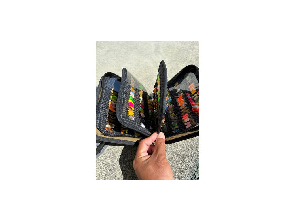 Do posledního detailu propracovaný penál na uložení plandavek od značky Velvet Arts. Yudai Ito navrhl tento penáls důrazem na maximální využití prostoru, praktičnost a pohodlné používání. Samozřejmostí je atraktivní vzhled a vysoká kvalita zpracování. V části pro zabodnutí háčků by zvolen dvouvrstvý materiál z látky a uretanu, který se ani při opakovaném zapíchnutí háčku neroztahuje. Díky tomu zapíchnuté plandavky v penálu dobře a nevypadávají. Mez každou stránkou je umístěna dělící vinylová fólie, která brání zachycení a poškození plandavek. Každá strana penálu je pro snadnější používání opatřena vodícími linkami, které usnadňují zapíchnutí háčku do správné pozice, aby bylo možné maximálně využít kapacitu penálu.