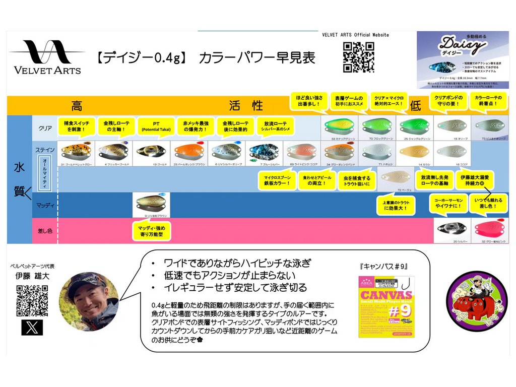 Daisy 0,4 g je první mikro plandavkou v nabídce značky Velvet Arts. S ultra malou siluetou o délce pouhých 18,3 mm jde o nástrahu, která je určena pro lov pstruhů v náročných turnajových podmínkách. Daisy 0,4 g má širokou, ale rychlou akci, kterou si zachovává i při nízkých rychlostech tažení. Chod nástrahy je stabilní bez nepravidelností. S hmotností 0,4g je určena pro lov na krátkou vzdálenost, její potenciál nejlépe využijete při lovu pstruhů těsně pod vodní hladinou nebo pro lov na propad v situacích, kdy pstruzi stojí blízko břehové hrany.