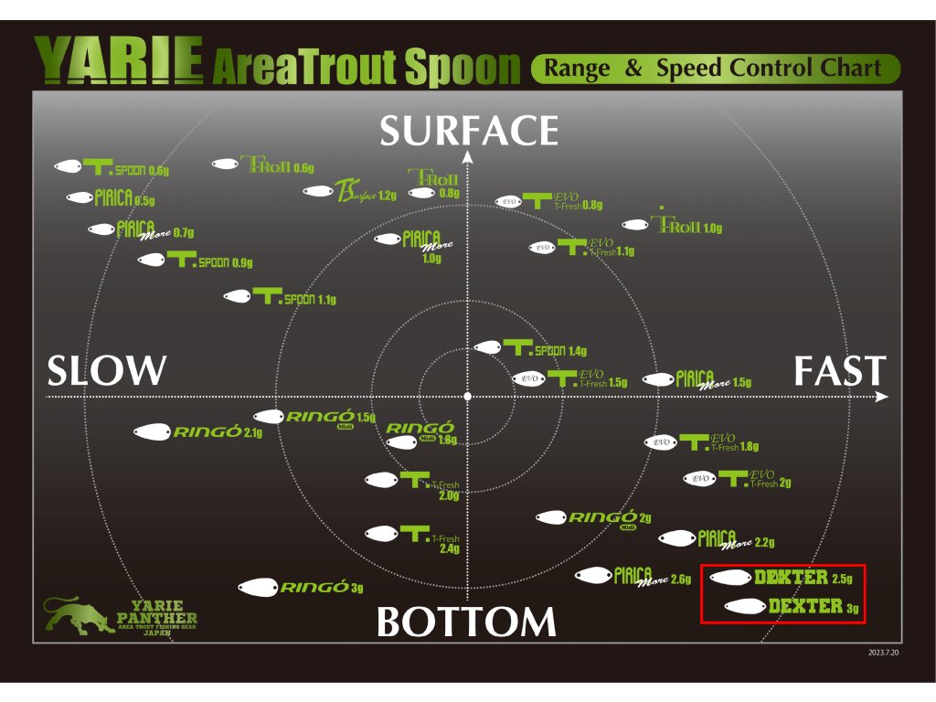Plandavka Yarie DEXTER je díky protáhlému tvaru a dobrým letovým vlastnostem vhodná k lovu dále od břehu. Vyznačuje se středně silným kývavým pohybem, aniž by se háček příliš pohyboval od středové linie, což vede k vyšší úspěšnosti proměněných záběrů. Navzdory své hmotnosti dokáže efektivně pokrýt vodní sloupec od hladiny až po dno. DEXTER skvěle funguje jako startovací plandavka s vyšší rychlostí vedení, ale i při klesající aktivitě ryb a pomalejším vedení dokáže být velmi úspěšný. Plandavke Yarie DEXTER je osazena bezprotihrotovým jednoháčkem Yarie.
